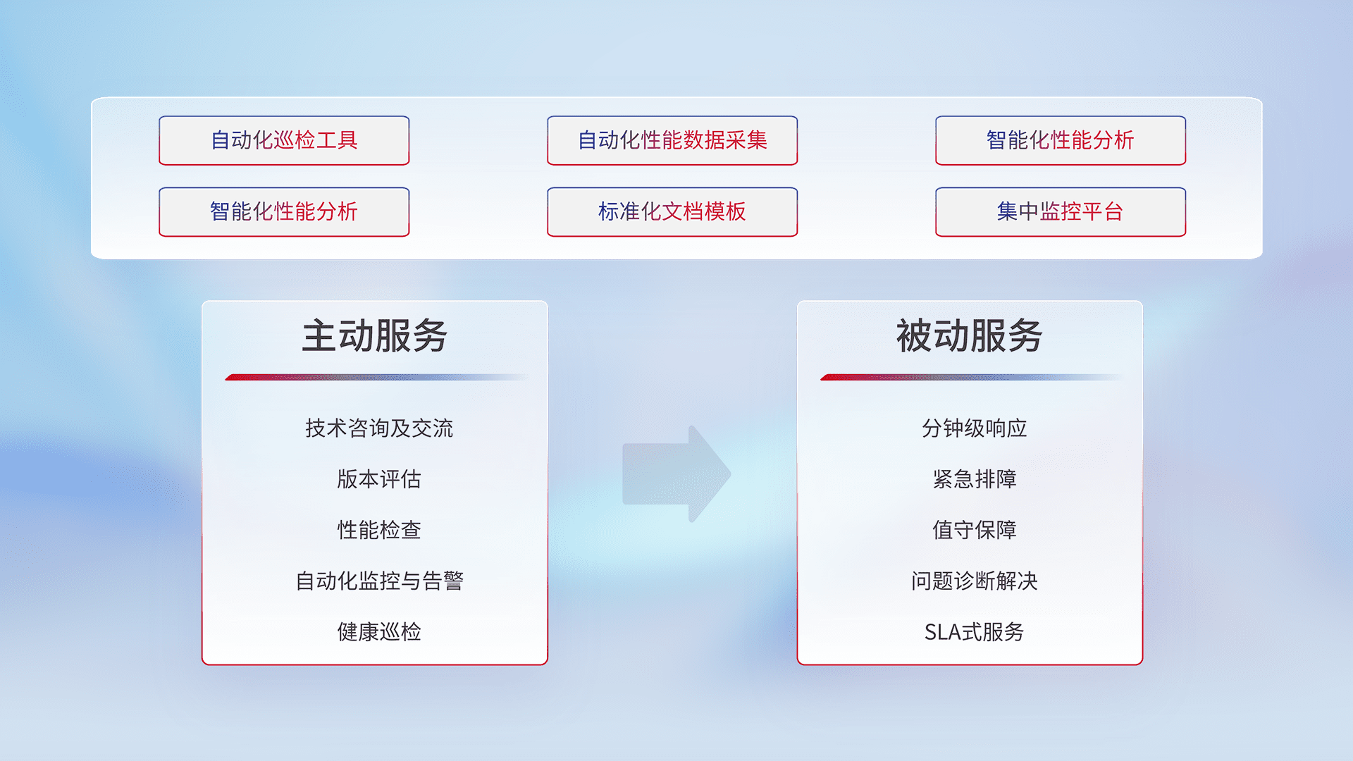 智能化工具和标准化文档,,保障服务质量,,,提供主动服务(包含技术咨询、、版本评估、、性能检查、、、自动化监控与告警、、、、健康巡检)和被动服务包含(分钟级响应、、、紧急排障、、值守保障、、、问题诊断解决、、SLA服务)。。。。